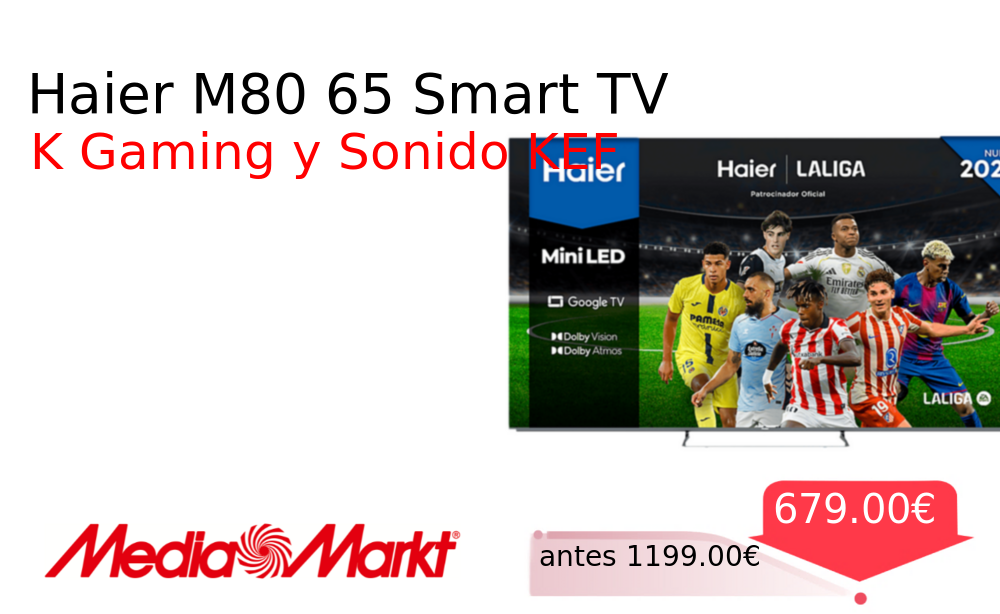 40% 📉 Vaya descuentazo‼‼ Haier M80 65 Smart TV❗️🆕 #MediaMarkt 📛Precio Ya 679.00€❗️ (PVP: +1199.00€) ✨Televisor Mini LED 65 con resolución 4K UHD y tecnología QD Sonido premium Dolby Atmos y altavoces KEF Ideal para cine y gaming. cholloya.com/HAIER_M80_65