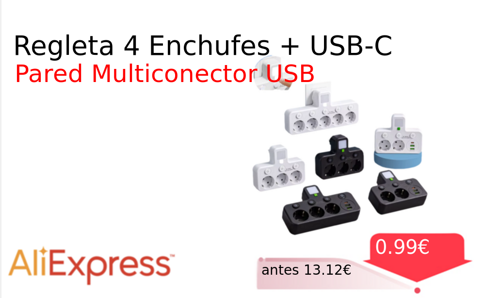 Mitad de precio✂️ Regleta 4 Enchufes + USB-C❗️🆕 #AliExpress 📛Precio Ya 0.99€❗️ (PVP: +13.12€) ✨Regleta de pared con cuatro enchufes europeos y tres puertos USB incluyendo tipo C Soporta alta potencia y se instala directamente sin cables. cholloya.com/REGLETA_USB_C_P