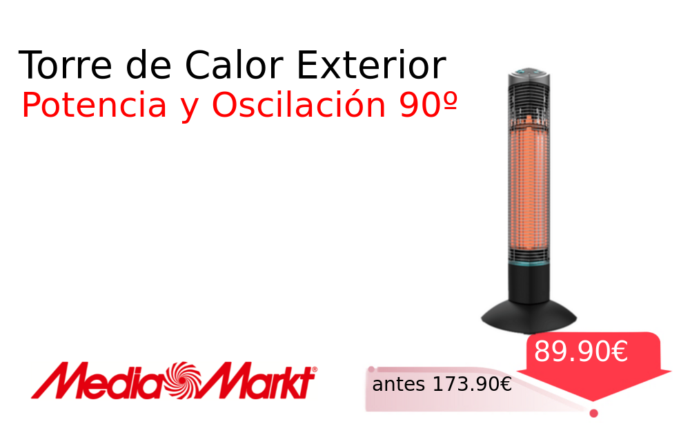 40% 📉 Vaya descuentazo‼‼ Torre de Calor Exterior❗️🆕 #MediaMarkt 📛Precio Ya 89.90€❗️ (PVP: +173.90€) ✨Calefactor de torre para exterior con 1000W de potencia halógena dos niveles de calor y oscilación automática de 90 grados para una calefacción uniforme. cholloya.com/CECOTEC_READYWA