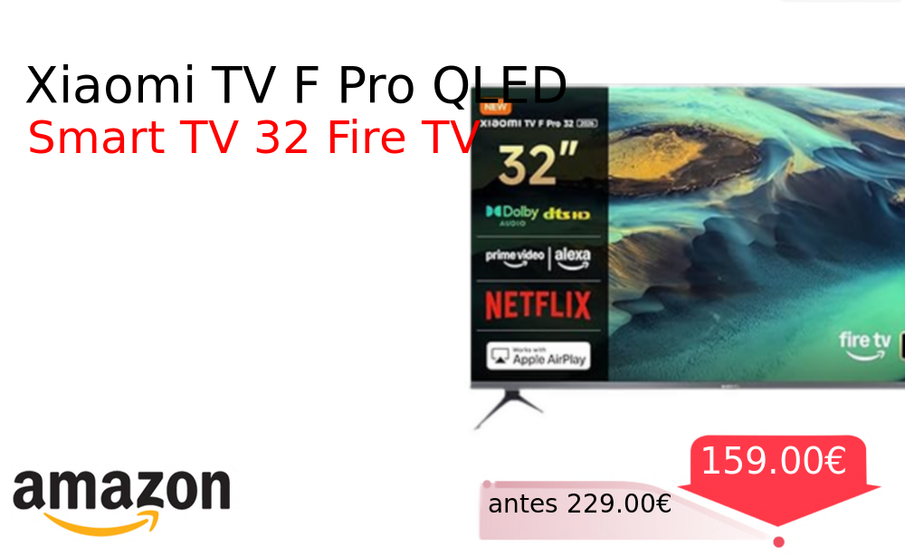 Más de un 30% 🚀 Xiaomi TV F Pro QLED❗️🆕 #Amazon 🇪🇸 📛Precio Ya 159.00€❗️ (PVP: +229.00€) ✨Smart TV QLED de 32 pulgadas con Fire TV integrado Control por voz Alexa sonido envolvente Dolby Audio y DTS Compatible con Apple AirPlay. cholloya.com/XIAOMI_TV_F_PRO