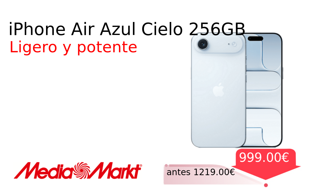 Buen Precio✨ iPhone Air Azul Cielo 256GB❗️🆕 #MediaMarkt 📛Precio Ya 999.00€❗️ (PVP: +1219.00€) ✨El iPhone Air redefine la ligereza con su diseño azul cielo Su pantalla OLED Super Retina XDR de 6 5 y el chip A19. cholloya.com/IPHONE_AIR_AZUL