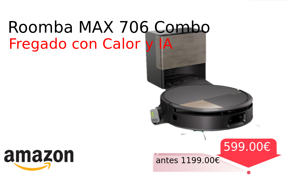 Mitad de precio✂️ Roomba MAX 706 Combo❗️🆕 #Amazon 🇪🇸 📛Precio Ya 599.00€❗️ (PVP: +1199.00€) ✨Robot aspirador y fregador autolimpiable con base de vaciado y lavado Tecnología IA para navegación precisa fregado con calor y secado rápido Multifunción completa. cholloya.com/ROOMBA_MAX_706