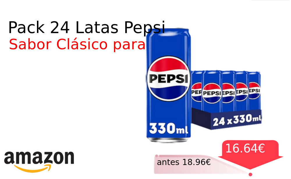 Buen Precio✨ Pack 24 Latas Pepsi❗️🆕 #Amazon 🇪🇸 📛Precio Ya 16.64€❗️ (PVP: +18.96€) ✨Refresco de cola clásico y burbujeante perfecto para compartir Pack de veinticuatro latas ideal para reuniones y momentos de disfrute con un sabor inconfundible. cholloya.com/PEPSI_24LATAS