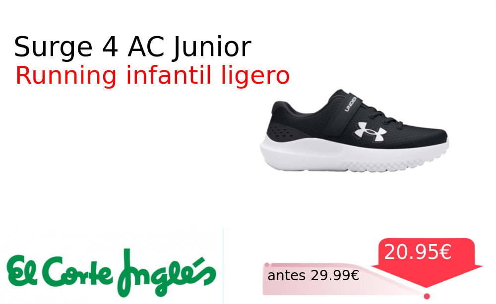 Más de un 30% 🚀 Surge 4 AC Junior❗️🆕 #Elcorteingles 📛Precio Ya 20.95€❗️ (PVP: +29.99€) ✨Zapatillas de running infantiles con amortiguación y comodidad óptimas Su diseño ligero y transpirable mantiene el ritmo en cada entrenamiento. cholloya.com/UA_SURGE4_AC_JR